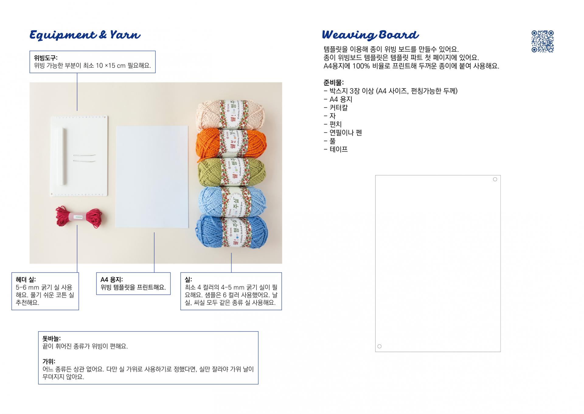 1. 위빙도구: 최소 10 ×15 cm 위빙 가능한 도구가 필요해요. 위빙 도구가 없어도 괜찮아요. 도안에 포함된 위빙보드 템플릿을 이용해 종이 위빙 보드를 만들어 쓸 수 있어요.
