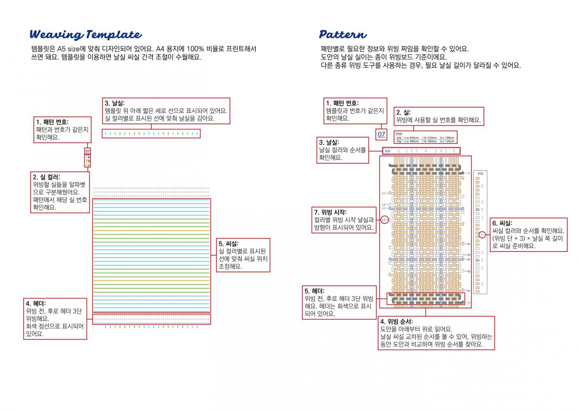 도안에는 가장 쉬운 패턴부터 배치되어 있어요. 첫 번째 패턴부터 순차적으로 위빙 해주는 게 좋아요.